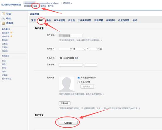 进入邮箱以后,点击“设置”→“账户”→“设置密码”即可设置登录密码(期间会弹出绑定微信的建议,可选则不绑定微信)。